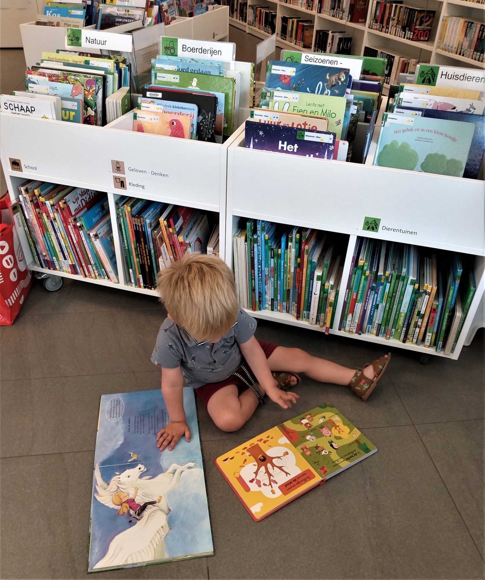 Zo zijn we ongeveer rond de leeftijd van 2 jaar met maandelijkse bibliotheekbezoekjes gestart. Want hoe heerlijk is het om niet 1, niet 2, maar wel 10 (!) boekjes naar hartelust te mogen uitkiezen. Met de bibzak in de aanslag, loopt ons zoontje elke keer opnieuw enthousiast de bib binnen. Het voelt als shoppen zonder betalen, we worden er elke keer opnieuw gelukkig van. Zijn hier ook nadelen aan? O ja, misschien eentje dan, want bij ons bibbezoek hoort ook de standaardvraag "met de bakfiets, mama?" en dan blijkt de plaats in de bak niet oneindig, en zitten onze zoontjes wel al eens driedubbel met de beentjes. Want ja, mama wil ook nog graag 10 boeken op haar naam uitlenen én voor broer nemen we dan meteen ook maar nog 10 boekjes mee. Gelukkig is de papa hier niet zo'n boekenwurm, want 40 boeken én 2 kinderen, dat zou misschien net teveel zijn voor de bakfiets... :-)